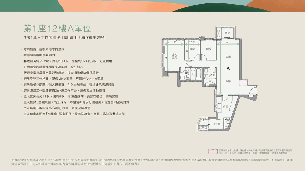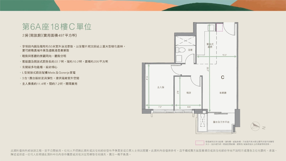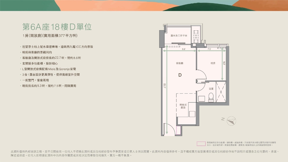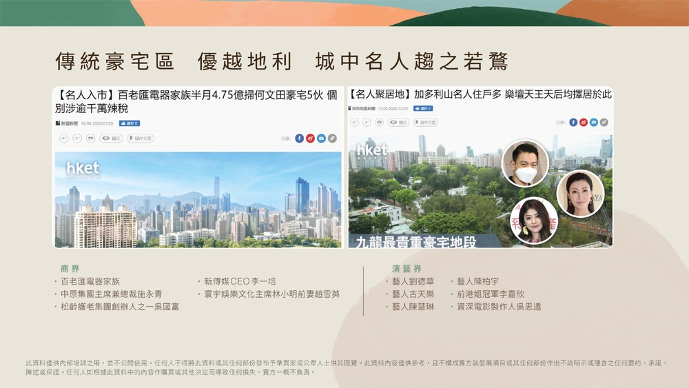 本廣告中之影片、相片、圖像及繪圖並非於期數或發展項目實景拍攝,亦並非説明期數或發展項目落成時之最後外觀或其景觀。該些影片、相片、圖像及繪圖經電腦修飾處理,影片、相片、圖像及繪圖內的裝置、裝修物料、設備、裝飾物及其他物件等及其展示之景觀不一定會在期數或發展項目或其周邊地方出現,僅供參考,且不構成任何賣方就期數或發展項目或其任何部份不論明示或隱含之任何要約、承諾、陳述或保證。